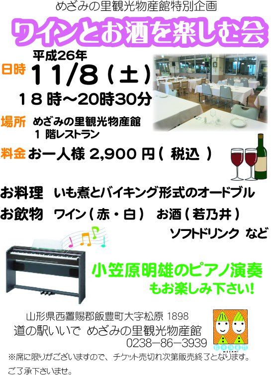 ワインや飯豊町の若乃井のお酒などを用意しております。