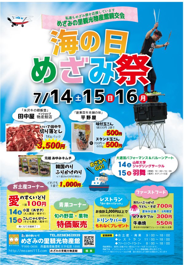 平成30年7月14,15,16日の3連休、道の駅いいで めざみの里観光物産館を会場に「海の日 めざみ祭 2018」を開催致します!今年は14日、山形大学ジャグリングサークルの皆さんによるジャグリングの公演、エンジョイ・ジョイさんによるパントマイム、15日は羽舞さんによる大道芸の公演で皆さまのお越しをお待ちしております!他にも14日限定でリリーズcafeさん来館!14,15,16日三条刃物屋さん来館!また14日・大人の方限定イベント、小豆のすくい取り!15日・こども限定イベント、こんにゃくゼリーのすくい取り!どちらも数量限定、1回100円となります。お早めにどうぞ!青果コーナーではシャインマスカット!入荷予定!レストランでは2,000円以上で次回使用いただけるドリンクバー券をもれなくプレゼントいたします。ファーストフードコーナーでは冷たいぶっかけそば・うどんが700円!かき氷ダブルがなんと300円!牛串焼550円!と暑い夏におすすめのモノばかりです!まだまだございます!肉の田中屋インショップ物産館店では前回も大好評の「いいで田中牛切り落とし 1kgパック」が3,500円!平野屋の味付け玉こん通常1袋330円を2袋で500円!またスタンド玉こん通常700円600gのところ500円にて!お土産にもどうぞご利用下さいませ!