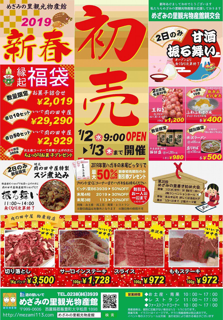 1月2日~3日にめざみの里観光物産館、お正月初売りをします。1/2は9:00オープン!甘酒の振る舞い(先着・無くなり次第終了)やお買い得な福袋、肉の田中屋でもご購入された方への牛すじ煮込みのお振舞、大変お得な牛肉の販売を行います。是非お立ち寄りください!!