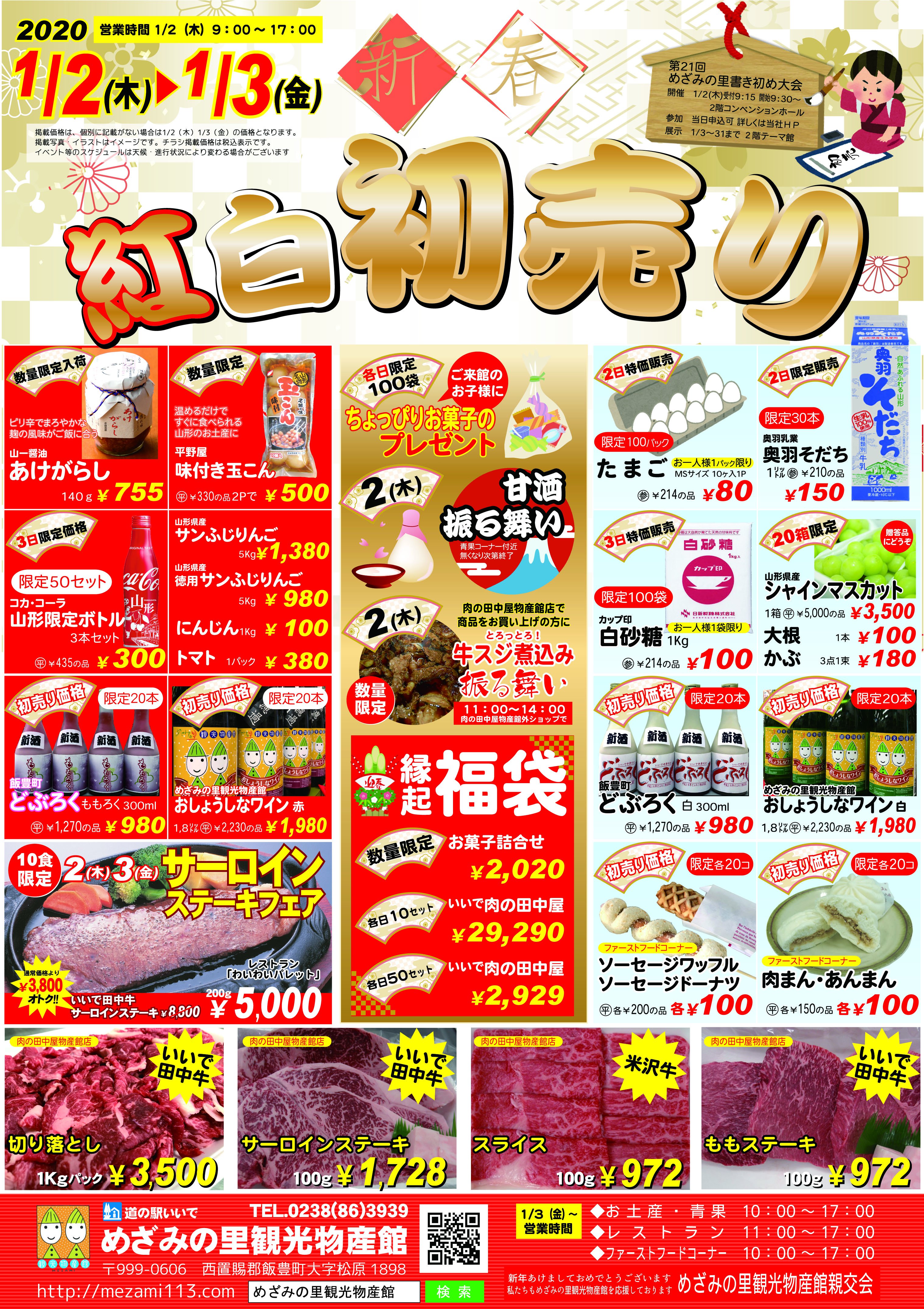 クリスマスも終わり年末の雰囲気ですね!めざみの里観光物産館では1月2日・3日に新春紅白初売りを行います!数に限りがあるものもございますのでお買い求めはお早めにお越しください。1月2日は飯豊町雪予報が出ております、今現在も雪が降っておりますがお越しの際道中お気を付けください!