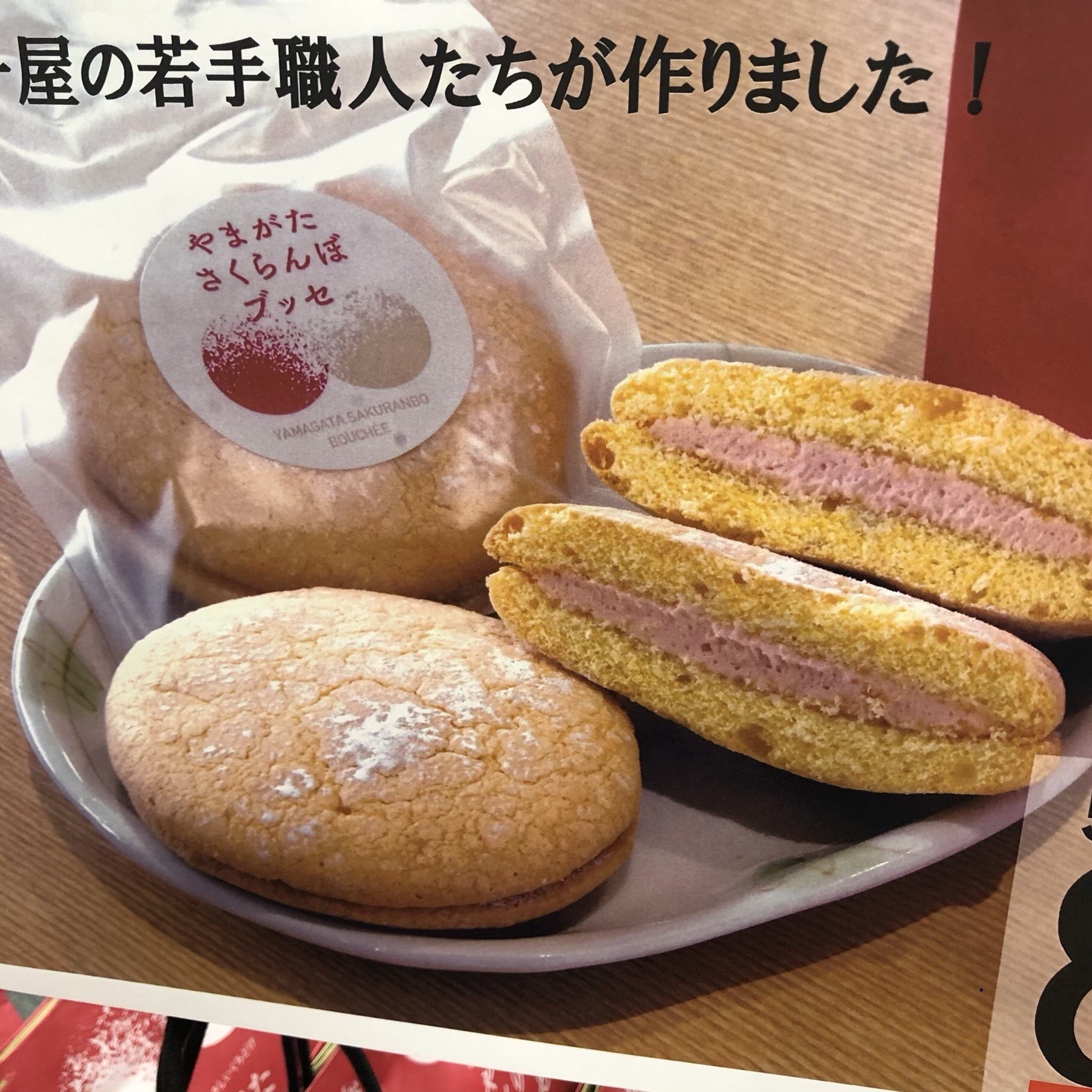 お菓子屋の若手職人たちが作りました!香り豊かなさくらんぼクリームをサクッと固めの生地でサンドしたこだわりのブッセです!