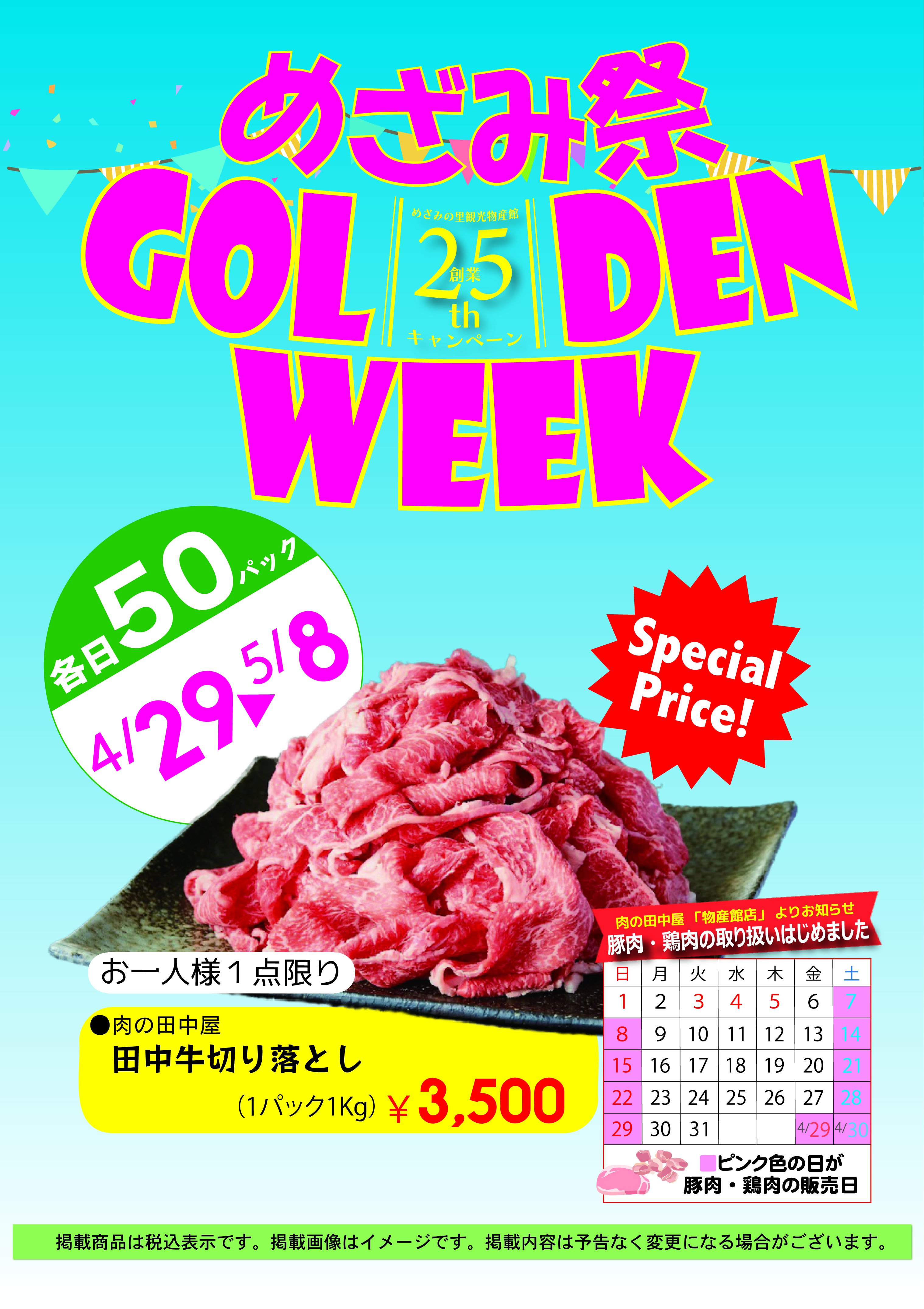 肉の田中屋物【産館店】では、期間中毎日先着50パック限定(お一人様1パックまで)で