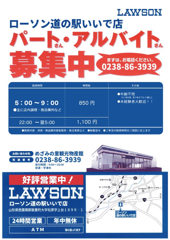 ローソン道の駅いいで店 スタッフ募集のお知らせ