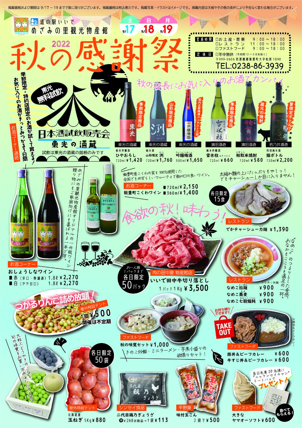 9/17(土)~19(月)まで秋の感謝祭を開催します!日本酒の試飲会や芋煮にもぴったり大人気田中屋の牛肉切り落とし、秋の味覚の果物やキノコ類、りんご詰め放題やレストラン、軽食コーナーからの新メニューなどなど盛りだくさんです!