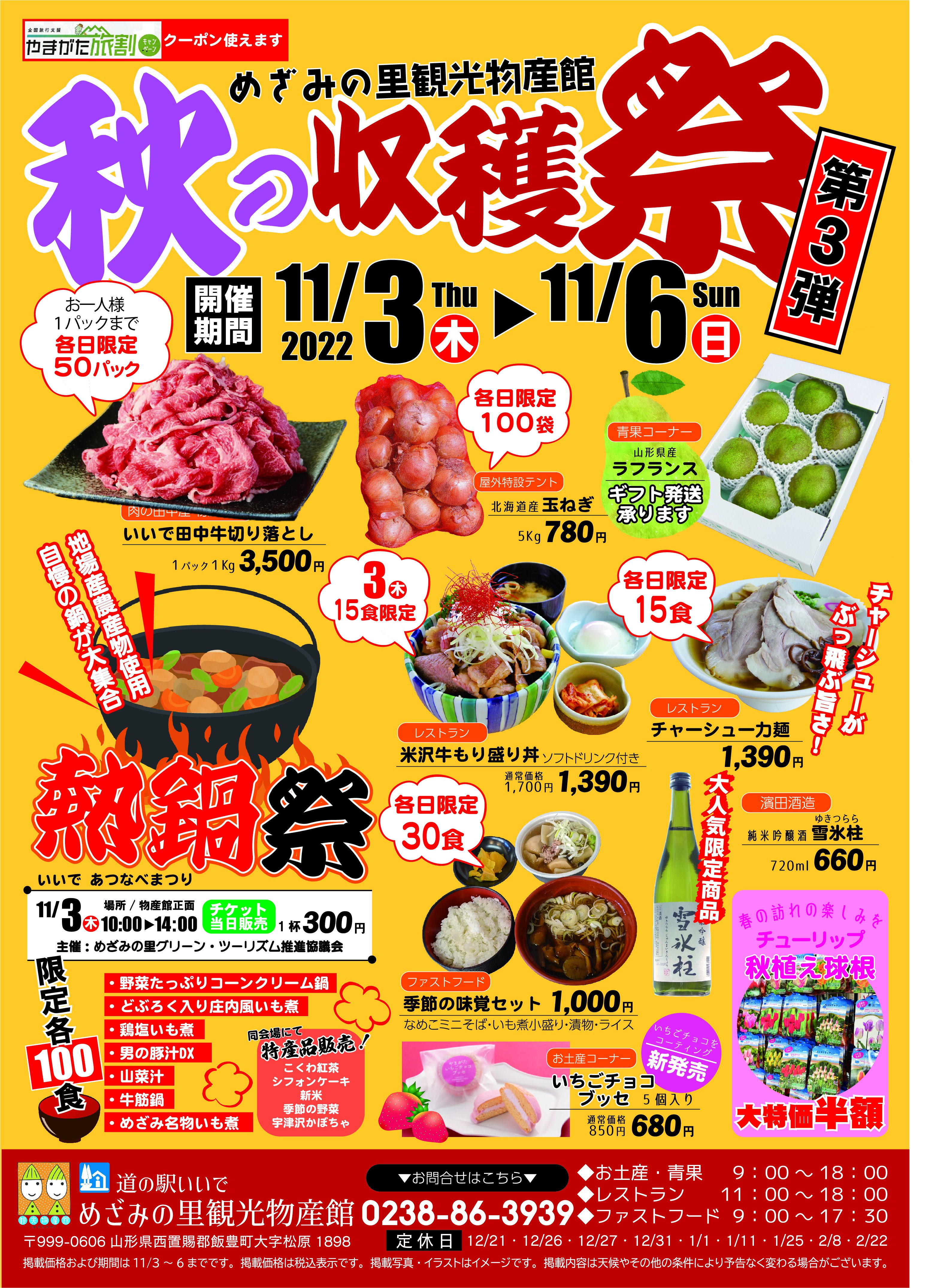 11/3は飯豊町熱鍋祭!!そして3~6日までは今年最後の秋の収穫祭を開催します。