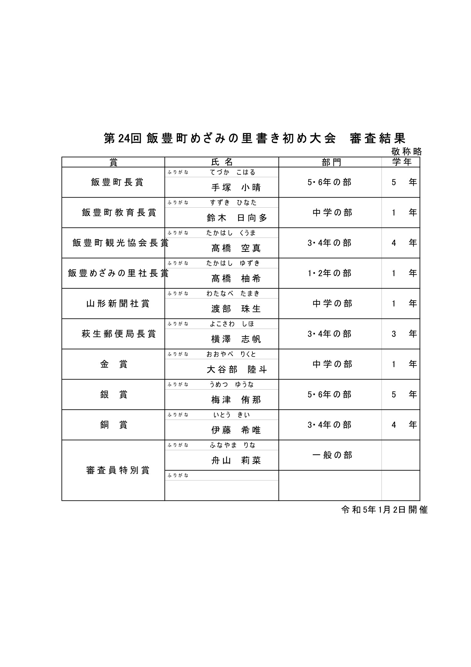 この度は第24回飯豊町めざみの里書き初め大会の開催にあたり、特段のご理解とご協力を賜り、厚く御礼申し上げます。