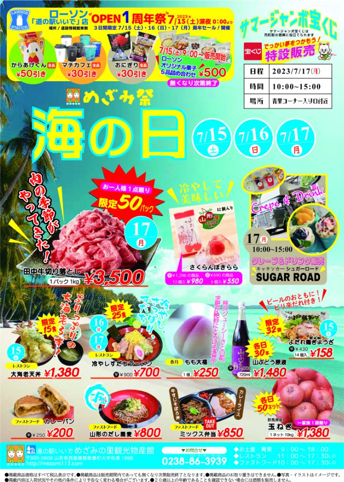 本日(15日)から17日まで海の日めざみ祭を開催中!!大人気肉の田中牛切り落としや冷たい麺類、大海老天丼、10㎏玉ねぎなど人気商品を多数取り揃えております!