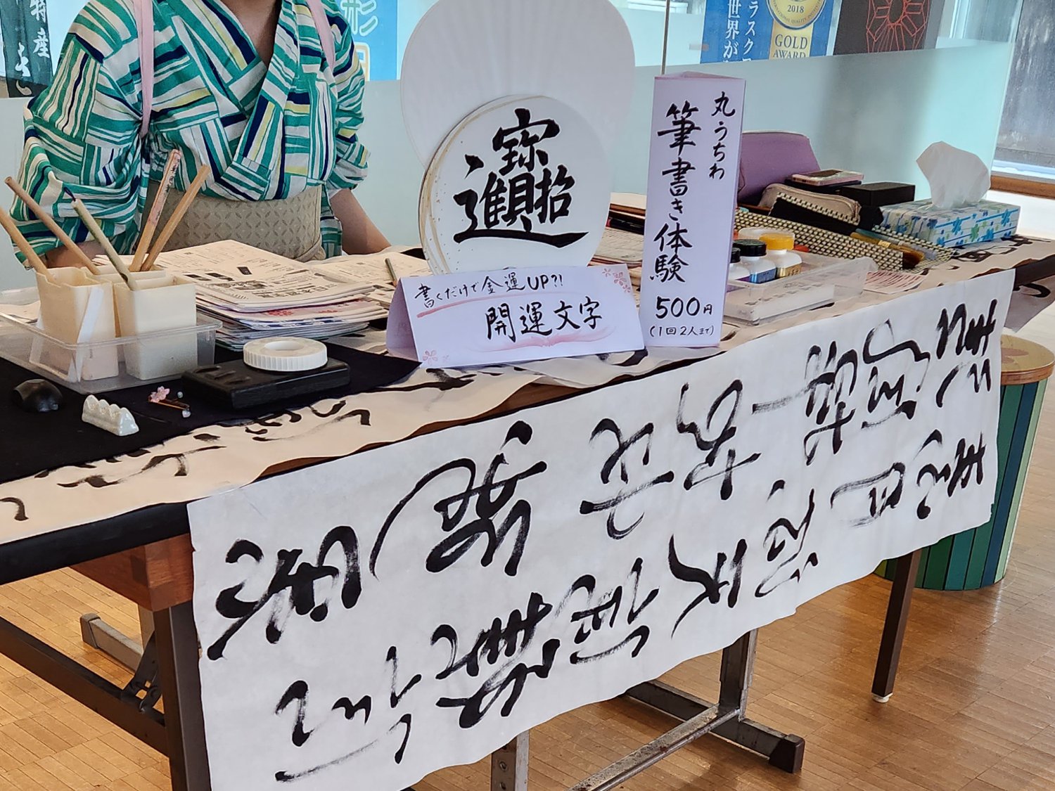 丸うちわの筆書き体験会を行っております。