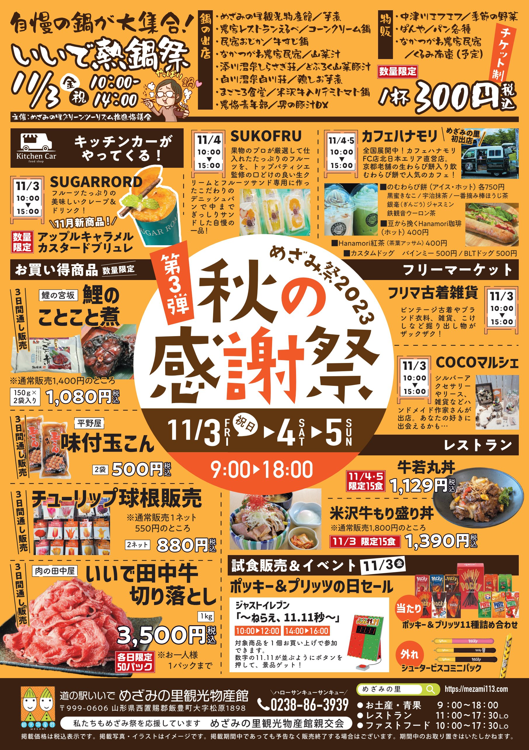 《秋の感謝祭のお知らせ》 11/3日~5日の3日間秋の感謝祭を開催します!大人気のキッチンカーや同時開催の毎年恒例いいで熱鍋祭!どの鍋を食べようか迷ってしまいますね(*^^*)ハンドメイドやフリーマーケットの出店もあります! お買い得商品を多数取り揃えて皆様のお越しをお待ちしております!