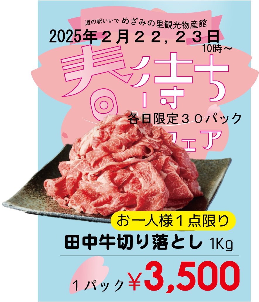山形県飯豊町道の駅いいでめざみの里観光物産館では2025年2月22、23、24日大雪の中ではありますが春待ちフェアを開催します!イベント時毎回大人気!肉の田中屋様「田中牛切り落とし1kg3,500円」22日、23日各日30パック限定で販売します!大雪が想定されます!十分お気をつけていただき、皆様のご来館をお待ちしております!